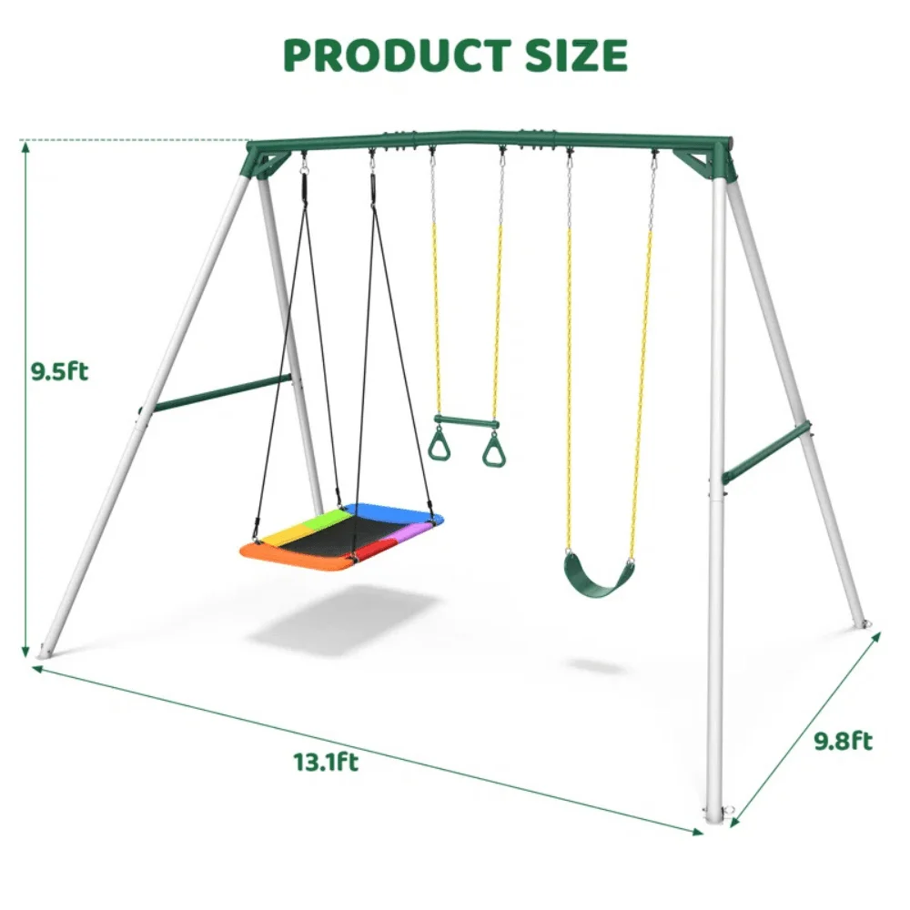 The Extra-Tall 9.5 Ft. Metal Swing Set is the ultimate backyard swing set, offering safety, durability, and hours of fun. With three versatile swing options, a strong steel frame, and a high weight capacity, this set grows with your family and provides a thrilling outdoor play experience for kids and adults alike.