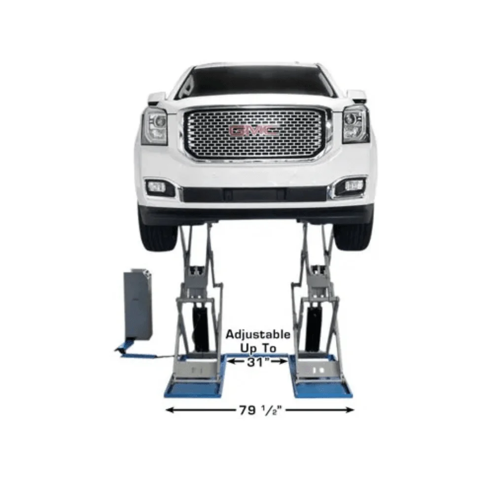 Its low-profile platform height (4.5 inches) and flush-mount capability provide a clean, unobtrusive appearance, making it an excellent choice for shop owners who want a sleek, space-efficient lifting solution. The adjustable width between platforms (up to 31 inches) ensures versatility for different vehicle frames.