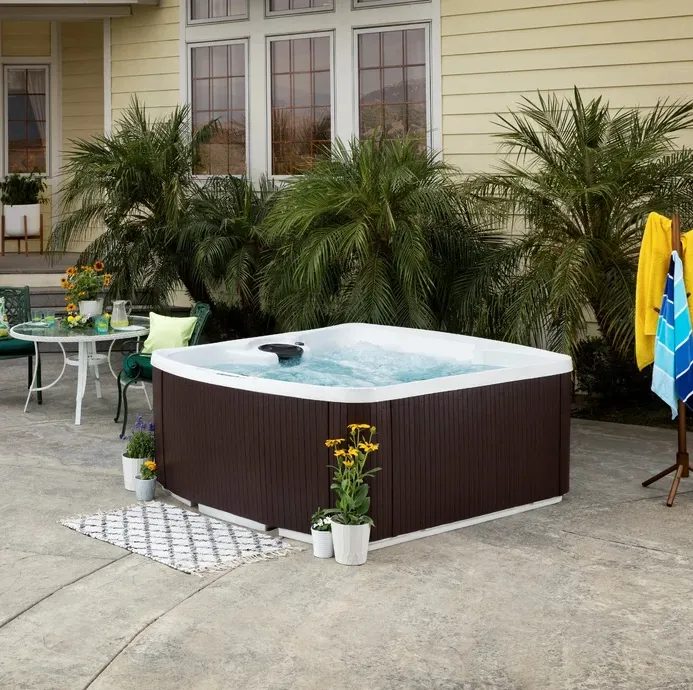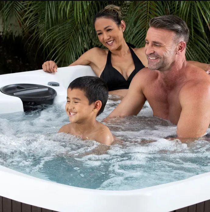 The Leganza by Lifesmart Spas is a 230V, 90-jet hot tub designed to bring the ultimate spa experience to your backyard. With comfortable lounge seating and space for up to 6 adults, this premium spa features a relaxing waterfall, multi-color underwater LED lighting, and a durable faux-wood exterior for a stylish, modern look.