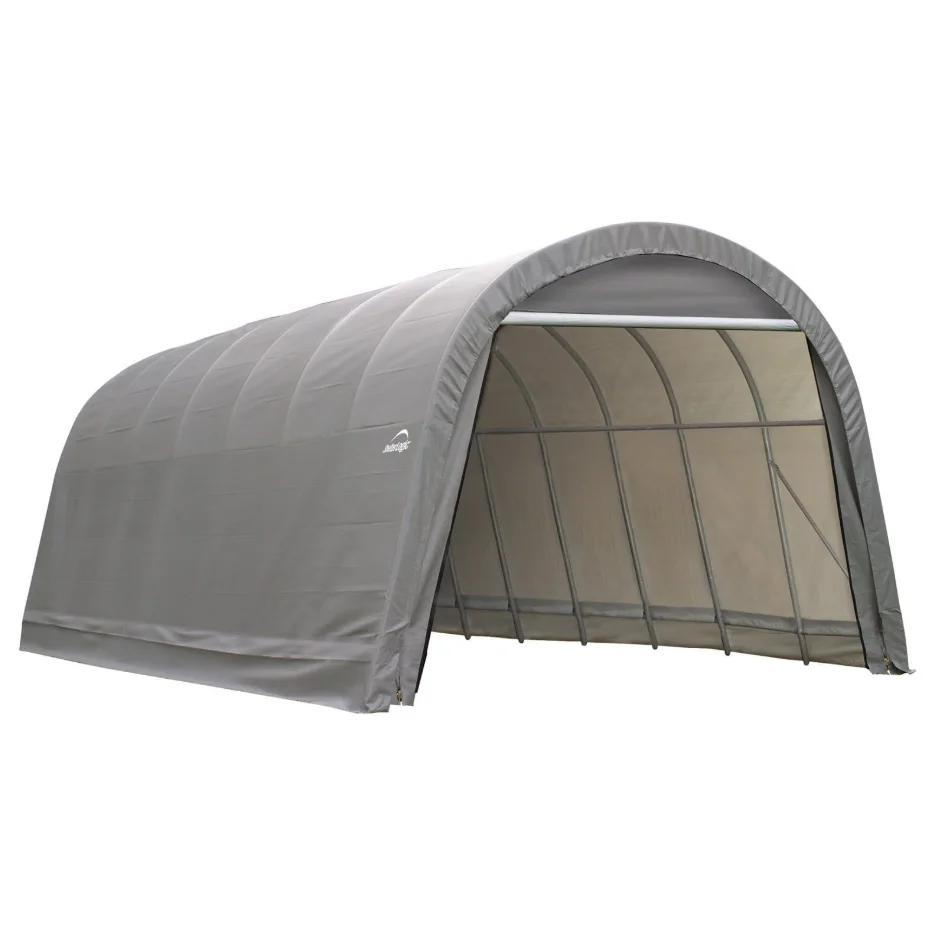 The ShelterLogic 15 x 28 x 12 Round Top Shelter is perfect for taller items, such as vans, boats, or trucks. The round top offers additional headroom while the wide base will accommodate almost any vehicle. Suitable for most areas, this canopy is made of a powder-coated steel frame and a waterproof cover.
