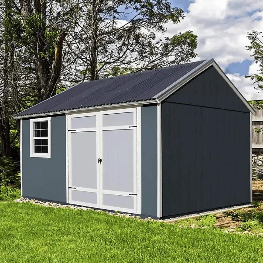 The Sonata 12 ft. x 10 ft. Outdoor Wood Shed is a robust and versatile structure, designed for multiple uses such as a storage space, detached office, or personal workout area. This large and durable shed features a Palram Suntop™ Polycarbonate roof system that won’t rust or corrode, ensuring long-term durability. The extra-wide double doors allow easy access for large equipment, while the interior loft, shelf, and operable window provide added convenience and functionality.
